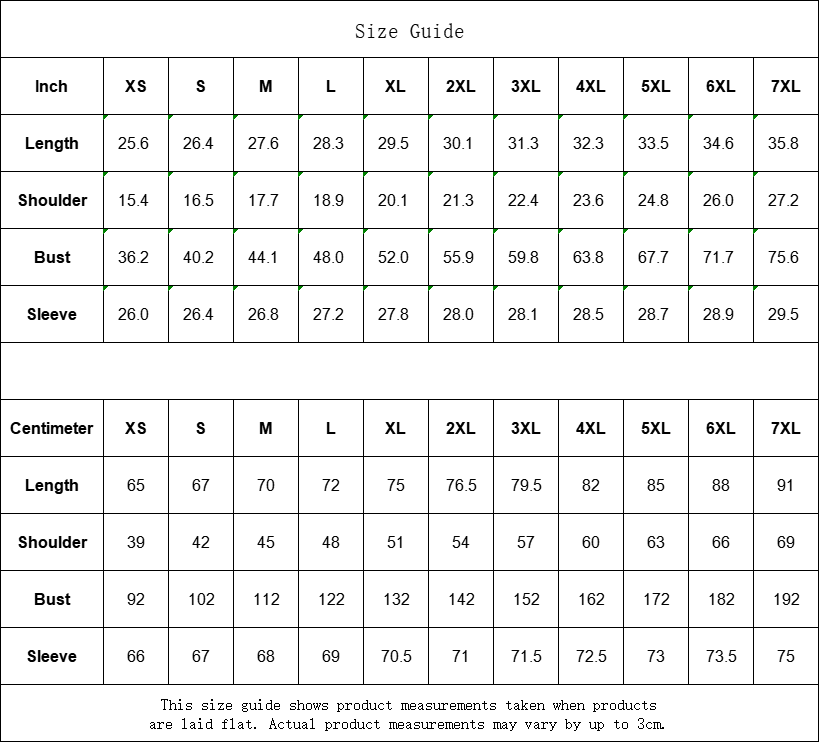 | Centimeter | XS | S | M | L | XL | 2XL | 3XL | 4XL | 5XL | 6XL | 7XL |